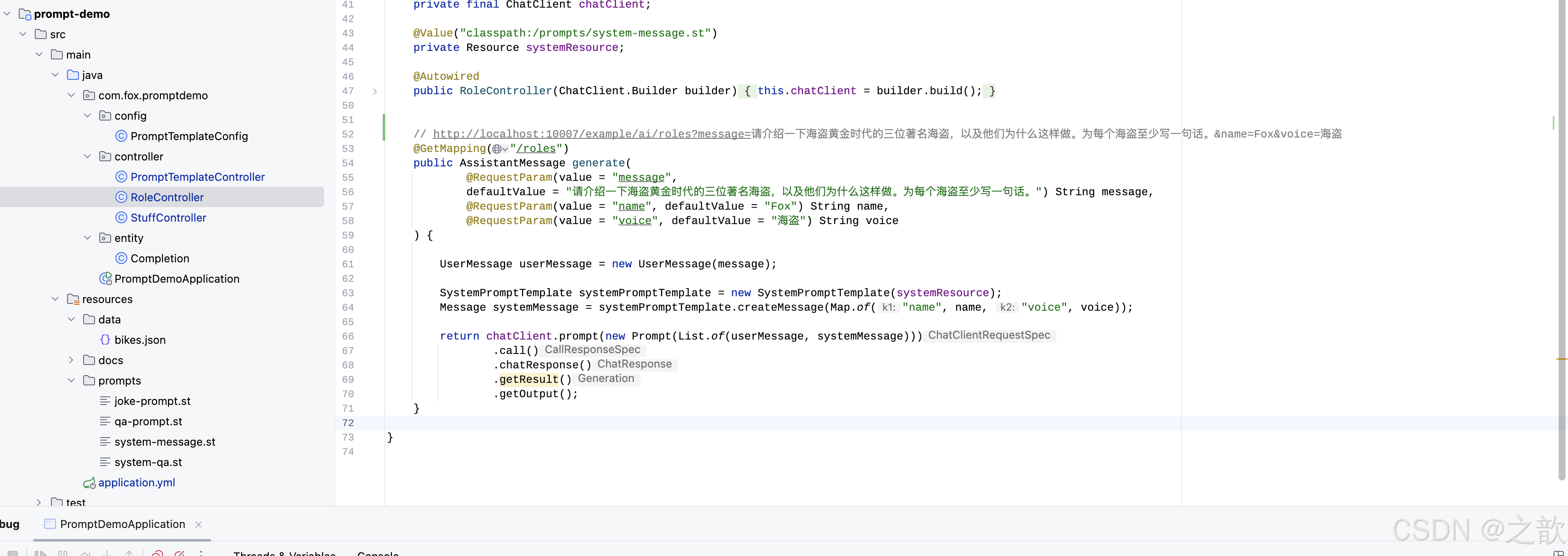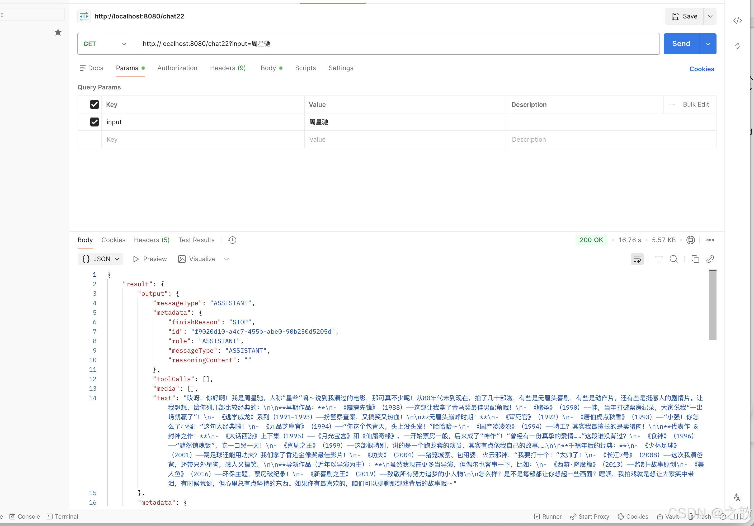 下面的代码段显示了通过调用 chatResponse() 返回 ChatResponse 的示例,相比于调用 content() 方法,这里在调用 call() 方法之后调用 chatResponse()。