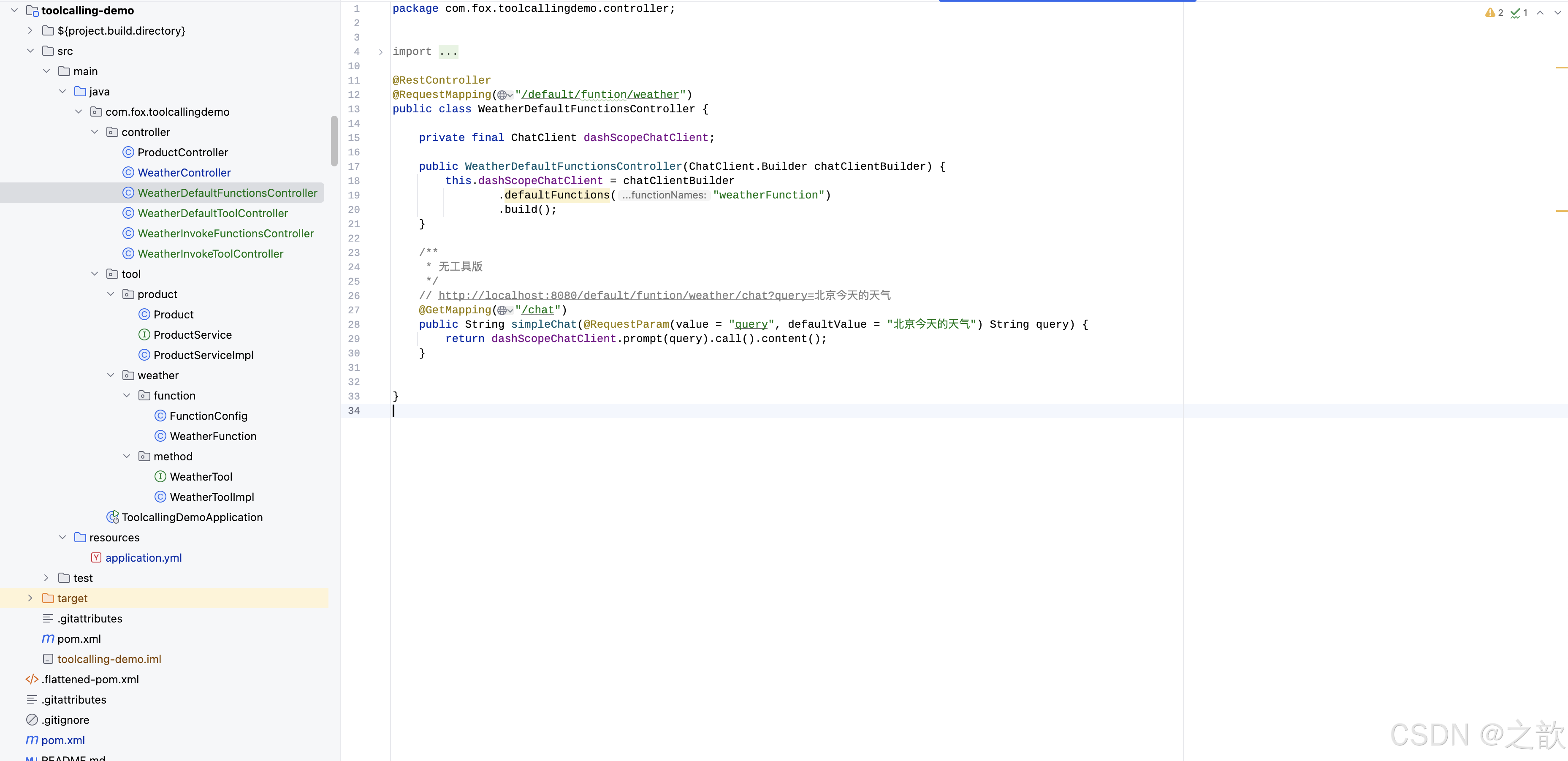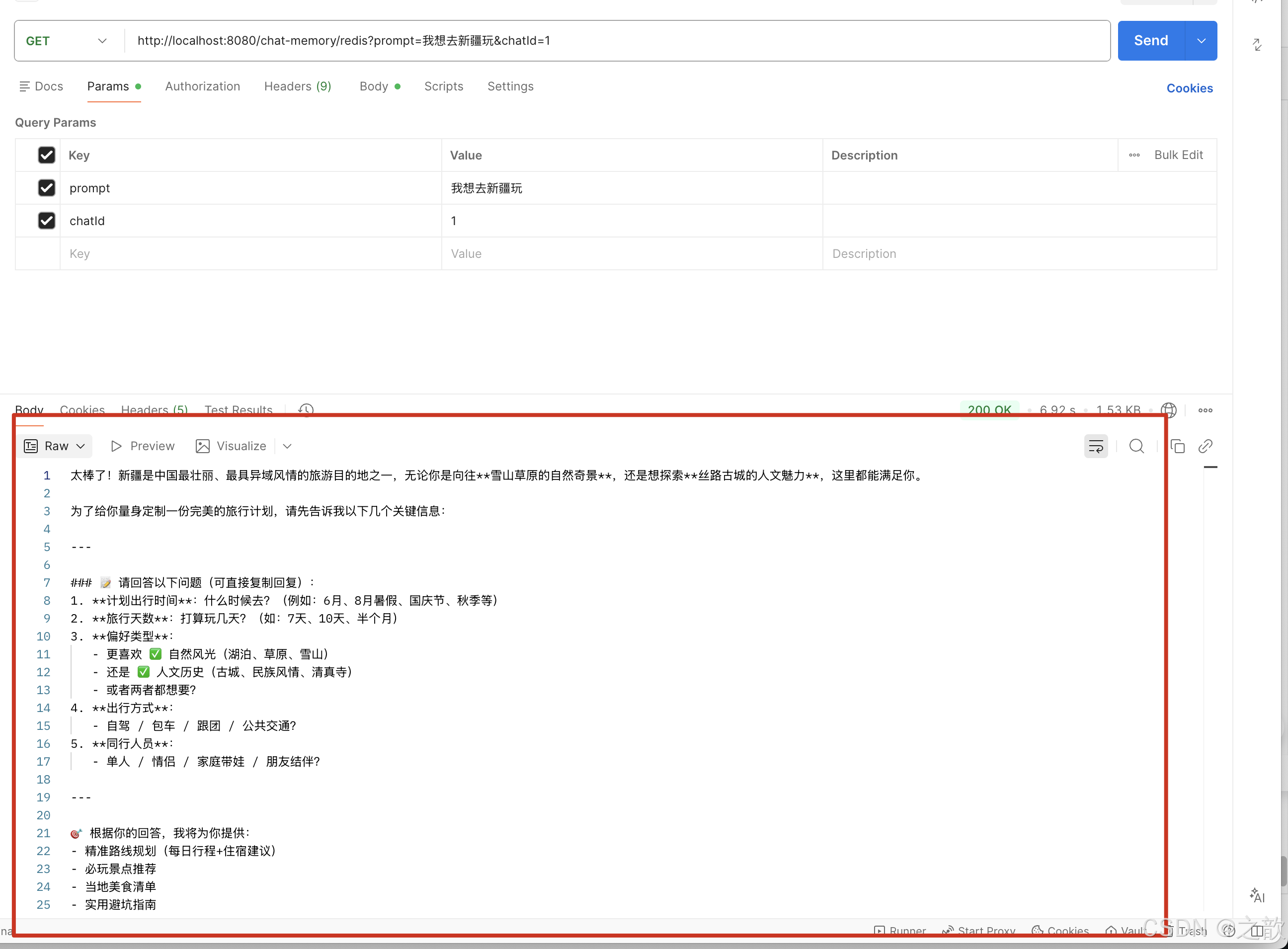 在快速开始示例中,就是使用的 Spring Boot 自动装配默认生成的 ChatClient.Builder 的 bean,把它注入到您自己的类中。这里是根据用户提问并从模型得到文本回答的简单例子: