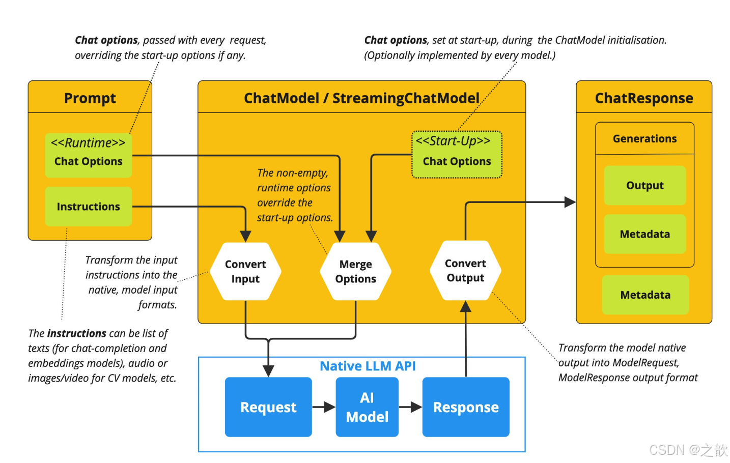 ChatClient 提供了与 AI 模型通信的 Fluent API,它支持同步和反应式(Reactive)编程模型。与 ChatModel、Message、ChatMemory 等原子 API 相比,使用 ChatClient 可以将与 LLM 及其他组件交互的复杂性隐藏在背后,因为基于 LLM 的应用程序通常要多个组件协同工作(例如,提示词模板、聊天记忆、LLM Model、输出解析器、RAG 组件:嵌入模型和存储),并且通常涉及多个交互,因此协调它们会让编码变得繁琐。当然使用 ChatModel 等原子 API 可以为应用程序带来更多的灵活性,成本就是您需要编写大量样板代码。
