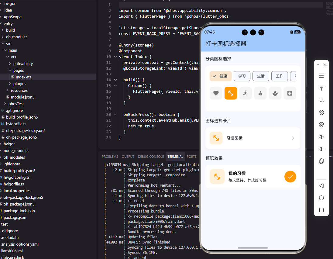 图标选择器在打卡工具类应用中用于为习惯设置代表性的图标。合适的图标可以帮助用户快速识别不同的习惯,同时也让习惯列表更加生动有趣。本文将详细介绍如何在Flutter和OpenHarmony平台上实现功能完善的图标选择器组件。