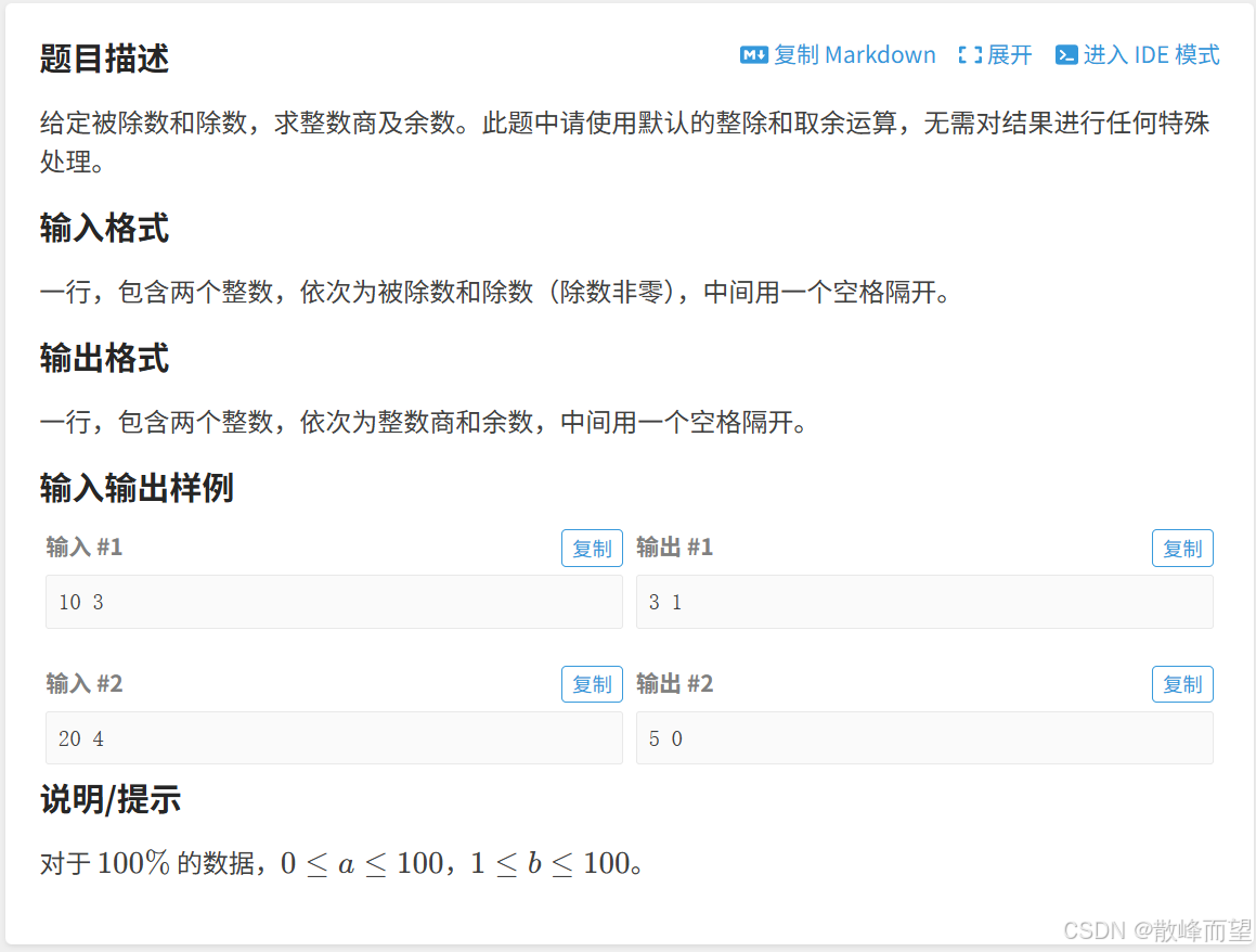 题目要求不仅得到整商,还要得到余数,即用 / 得到商,用 % 得到余数