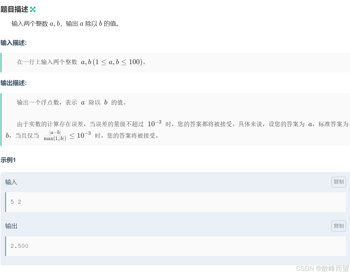 根据题目要求输入两个整数然后相除得到一个小数,并且只有小于等于 10^3 时才被接受。