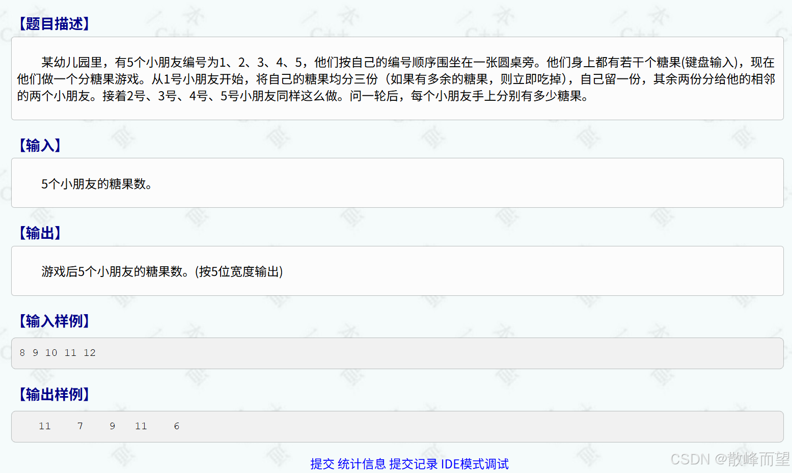 这道题稍微复杂一些,这里举个例子。假如 1 小朋友有 7 个糖果,需要分成 3 份,分别给旁边的 2 和 5 小朋友,即最后 1 小朋友留下 2 个糖果,2 和 5 各得 2 糖果,多的糖果被 1 小朋友吃掉。之后 2,3,4,5 小朋友重复以上操作。