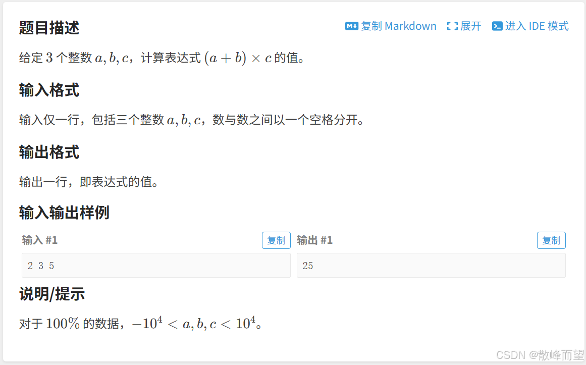 这个题目一定能注意,数据范围,-10^4 < a,b,c < 10^4,(a+b)*c 的结果也不会超过有符号整型的最大值,而如果取值范围变成 -10^5 < a,b,c < 10^5,就需要使用 long long 类型了。