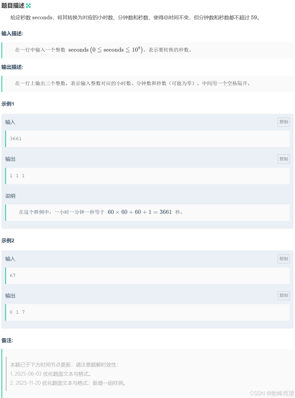 由题目的示例 1,我们可以推测出秒是余数,而分钟需要除以 60 并余下 60 得到,小时除两次 60。