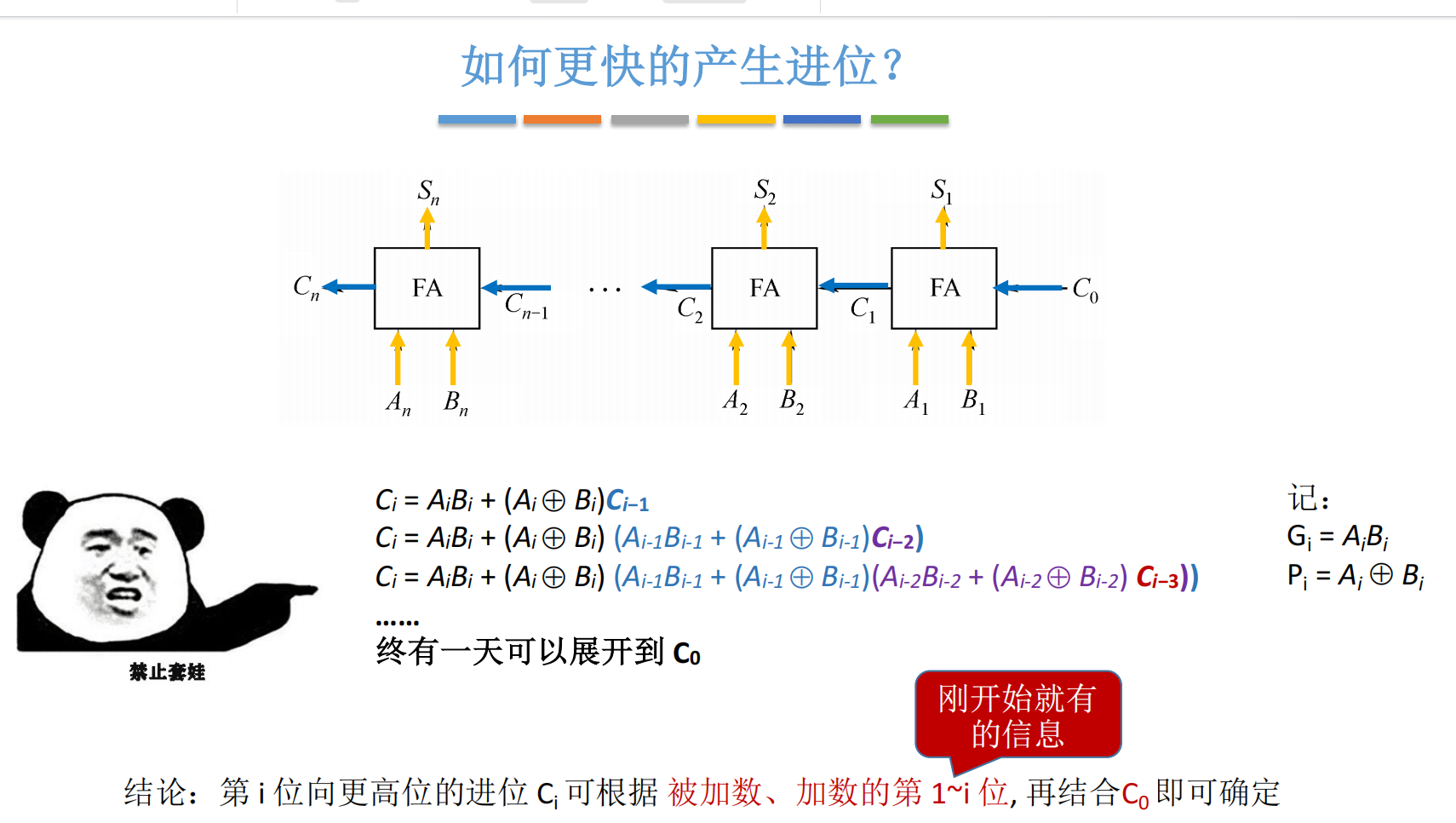 当 n 很大时(比如 32 位、64 位),这种延迟会显著拖慢 CPU 的运算速度。因此,我们必须寻找一种方法,让高位进位不再依赖低位逐级传递,而是尽可能"提前知道"或"直接计算"出来。