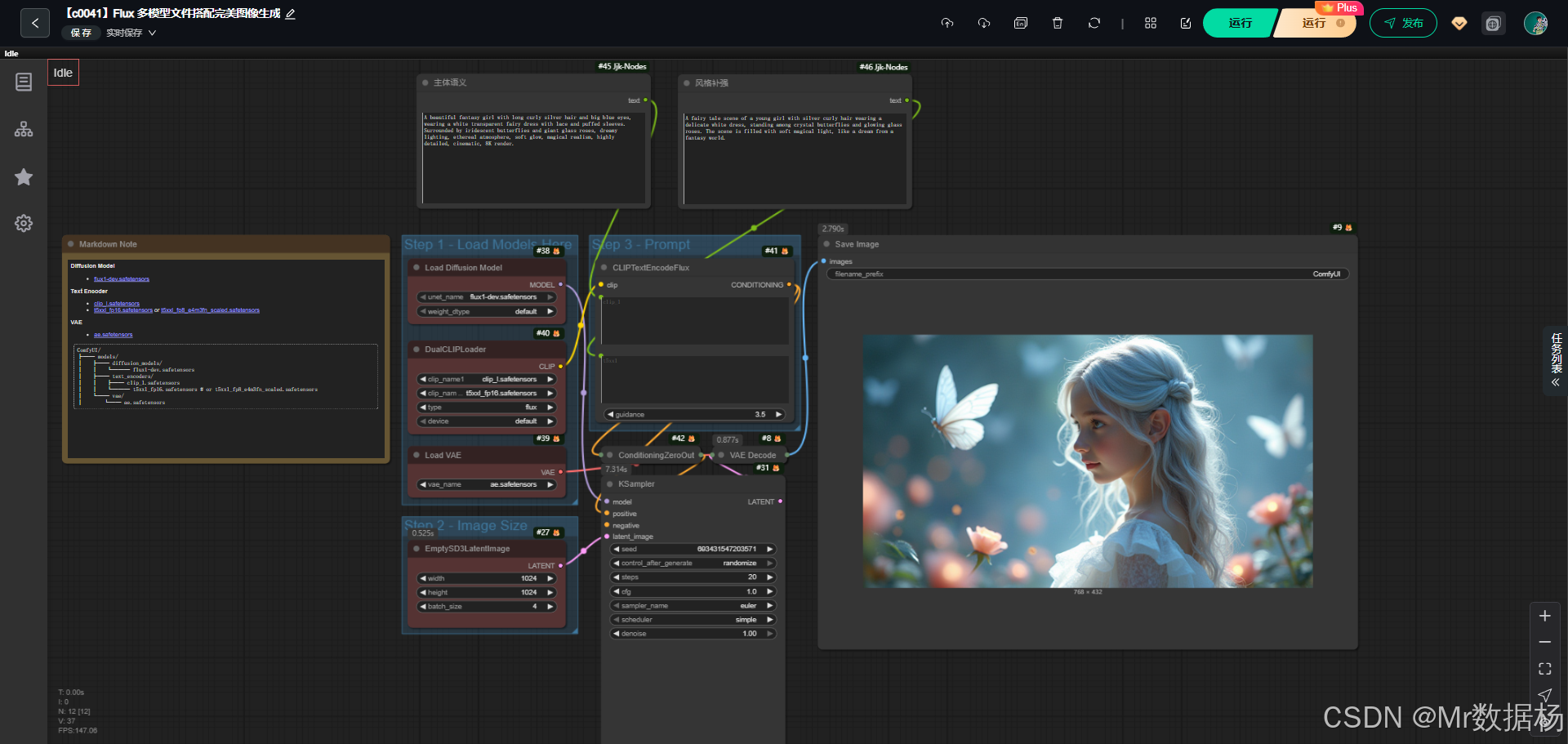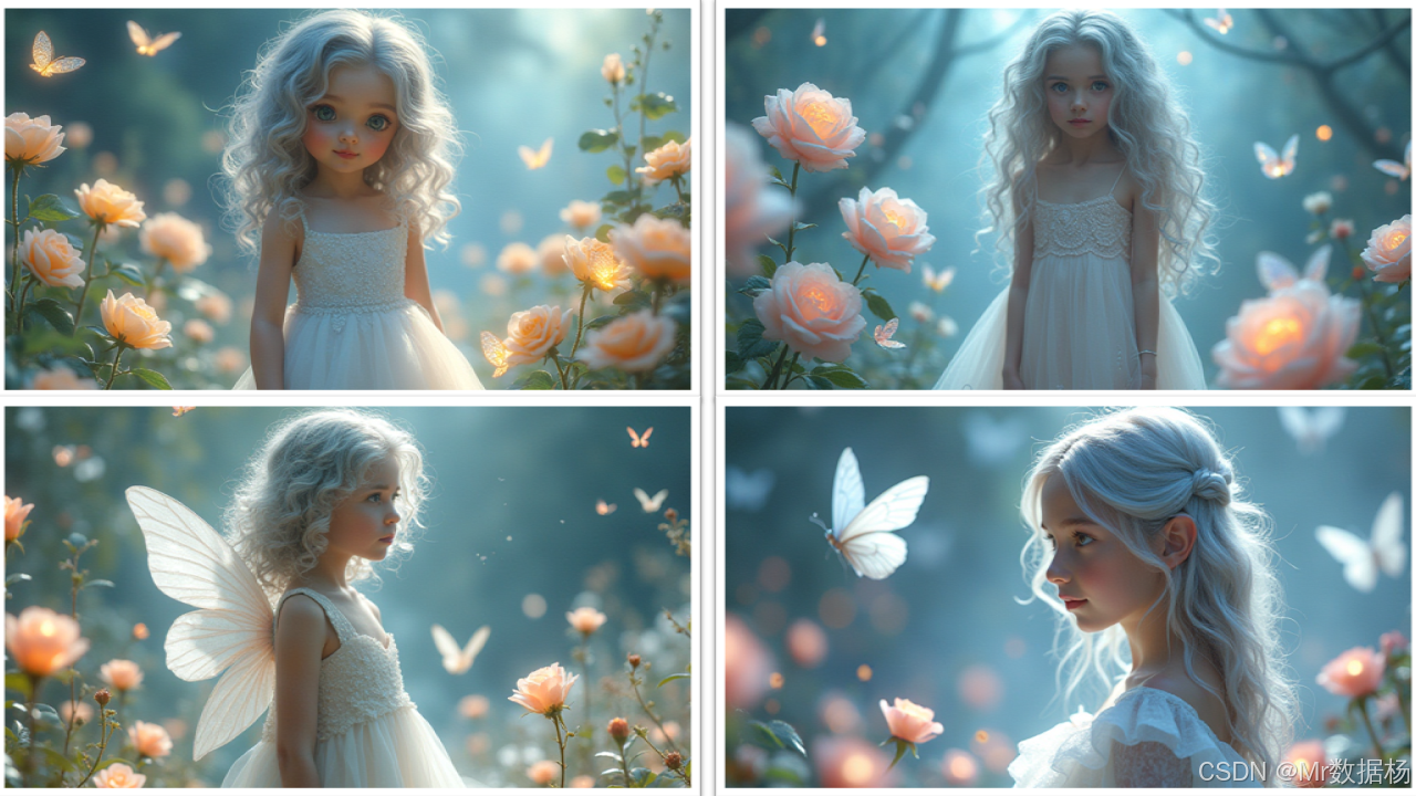 | CLIPTextEncodeFlux | Prompt 1: A beautiful fantasy girl with long curly silver hair and big blue eyes, wearing a white transparent fairy dress with lace and puffed sleeves. Surrounded by iridescent butterflies and giant glass roses, dreamy lighting, ethereal atmosphere, soft glow, magical realism, highly detailed, cinematic, 8K render. Prompt 2: A fairy tale scene of a young girl with silver curly hair wearing a delicate white dress, standing among crystal butterflies and glowing glass roses. The scene is filled with soft magical light, like a dream from a fantasy world. Weight/CFG: 3.5 | 将多条正向 Prompt 转化为 CLIP 嵌入并融合,用于控制生成模型的图像语义和风格,使多元素场景、高细节角色和环境得到精确呈现。 |