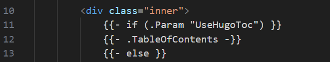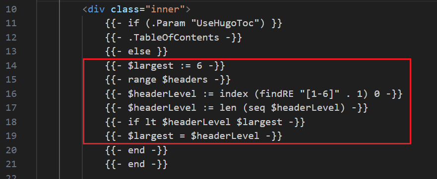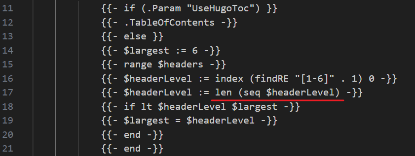 这里要区分下 Hugo 模板语言和 Go 语言,虽然 Hugo 是用 Go 语言开发的,但在比如 toc.html 这样模板文件上,写的不是 Go 代码,而是 Hugo 的模板语言(基于 Go 的 text/template 和 html/template)