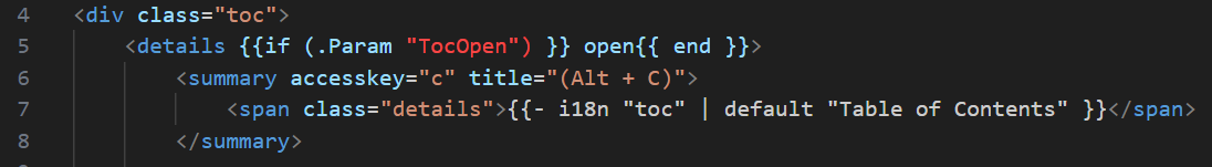 {``{if (.Param "TocOpen") }} open{``{ end }}:Hugo 模板语法,作用是如果在文章的标题开头写了TocOpen = true,比如