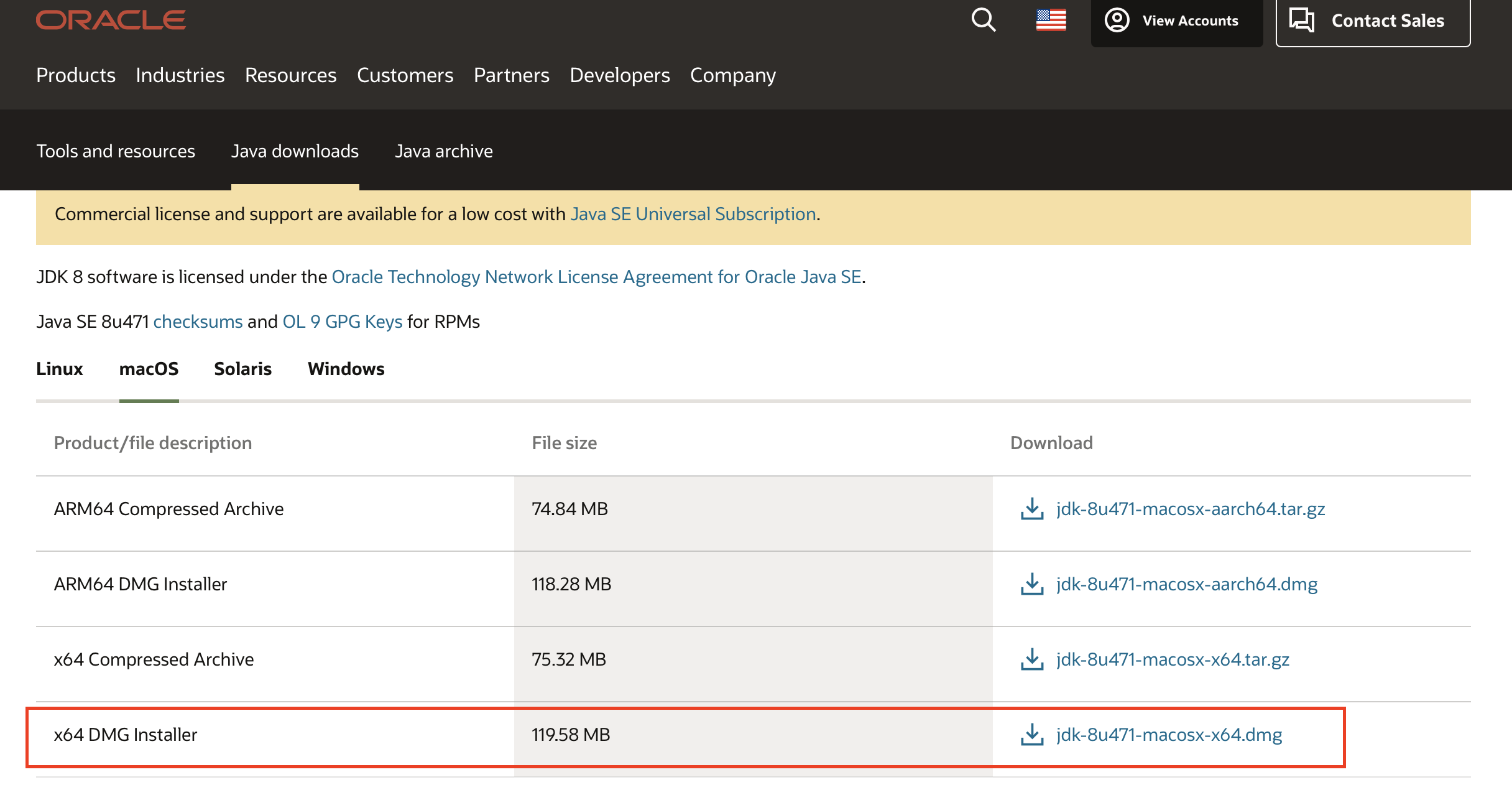 1.Orcal官网下载JDK:https://www.oracle.com/java/technologies/downloads/#java8-mac