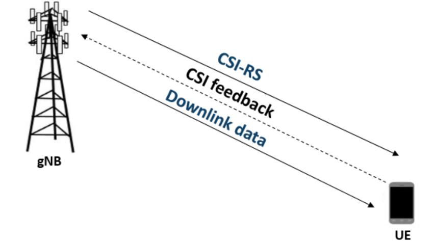 一般来讲,UE 使用信道状态信息参考信号(CSI-RS)来测量 CSI 反馈。接收到 CSI 参数后,gNB 会相应地调度下行数据传输(如调制方案、码率(对应CQI)、传输层数(对应RI)和 MIMO 预编码(对应PMI))。本图展示了 CSI-RS 传输、CSI 计算与反馈,以及基于 CSI 参数调度的下行数据传输概览。