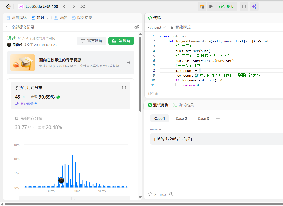 max_count(记录全局最长长度,初始为 1,因为至少有 1 个元素)、now_count(记录当前连续序列长度,初始为 1)、now(记录当前基准元素,初始为有序列表第一个元素); - 循环判断 :从列表第二个元素开始遍历,若当前元素等于「基准元素 + 1」,说明连续,当前计数