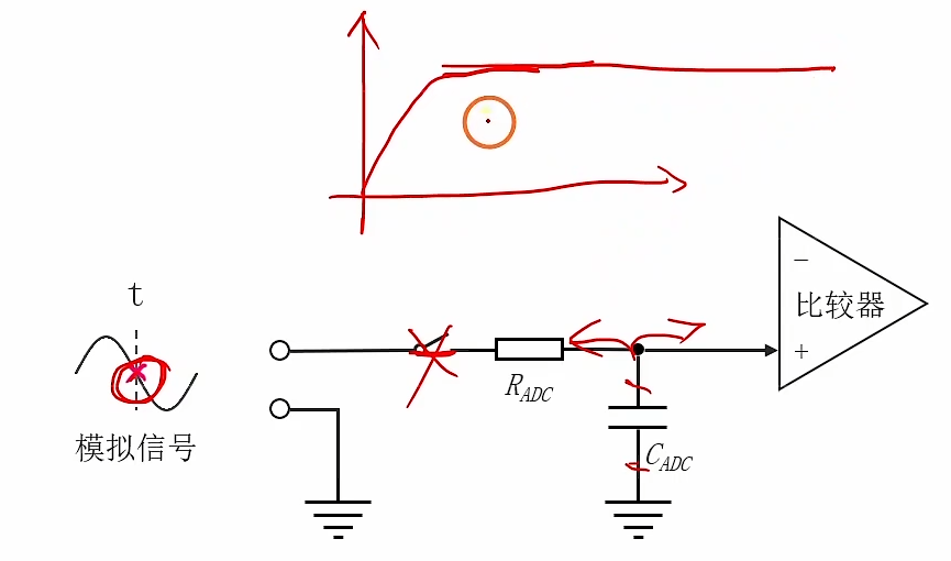 假设本次输入信号的电压为2.21V,采样保持电路的开关闭合, C A D C C_{ADC} CADC 充电。