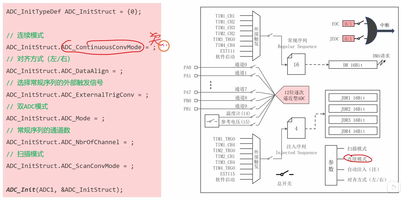 - 转换模式:单次转换(测一次就停);连续转换(测完一次马上测下一次,不停歇);扫描模式(一次性测量多个通道)。