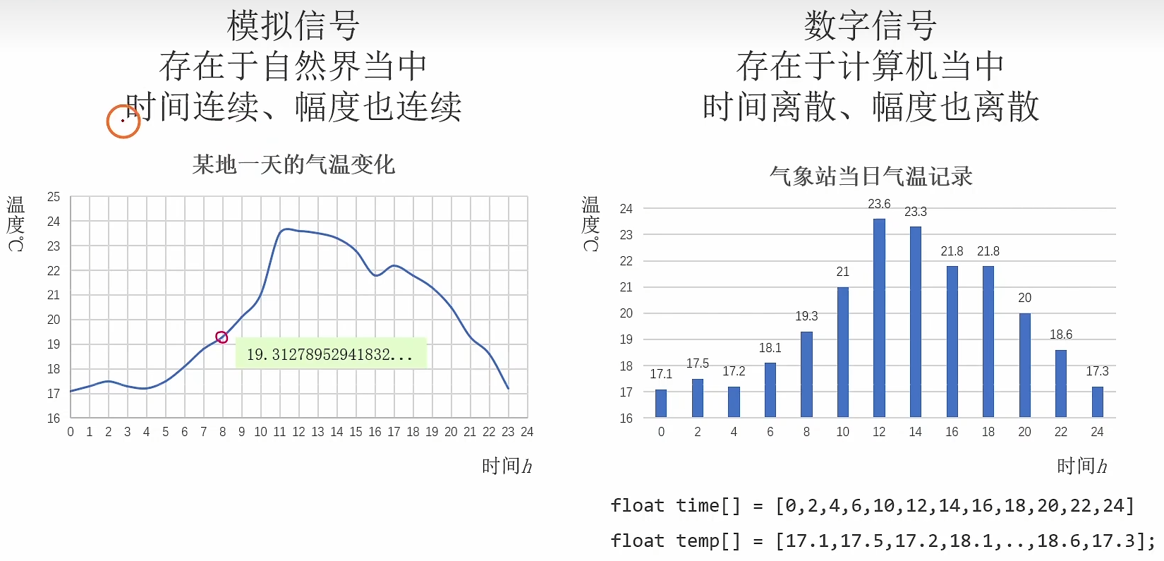 以气温为例,自然界中温度是随时间一直变化的,它连续不断,这种就是模拟信号。
