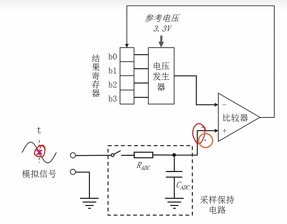 经过合适的采样时间后, C A D C C_{ADC} CADC的电压与输入电压相等,断开开关。由于"虚断",比较器的V+电压(即 C A D C C_{ADC} CADC的电压不变)。