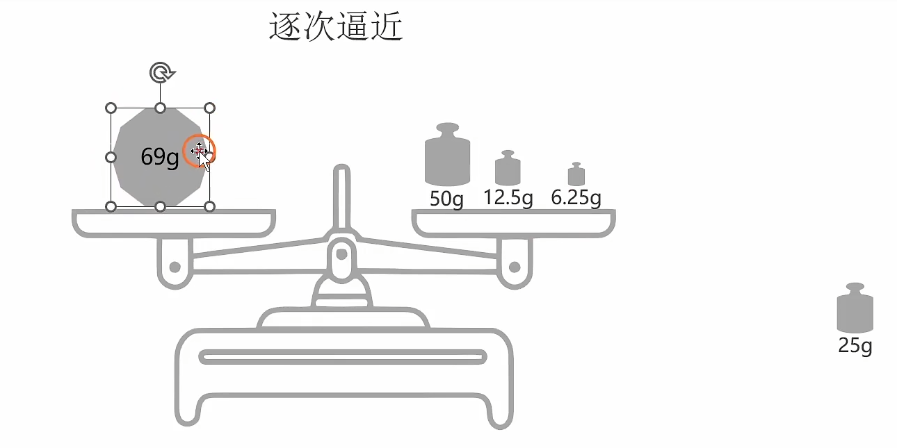 再加一个更轻的砝码(12.5g),现在右盘总重 = 50 g + 12.5 g = 62.5 g = 50g + 12.5g = 62.5g =50g+12.5g=62.5g 小于左盘,天平还是左倾,保留这个砝码,第三位记为 1。