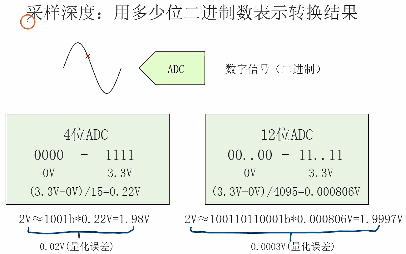 (1)如果采样深度很低(比如 2-bit) ,系统只能把 0-3.3V 分成 2 2 = 4 2^2 = 4 22=4份,尺子的刻度非常稀疏:0 V,1.1 V,2.2 V,3.3 V。如果输入1.5 V,ADC可能读出"1.1V"或者"2.2V",误差巨大。