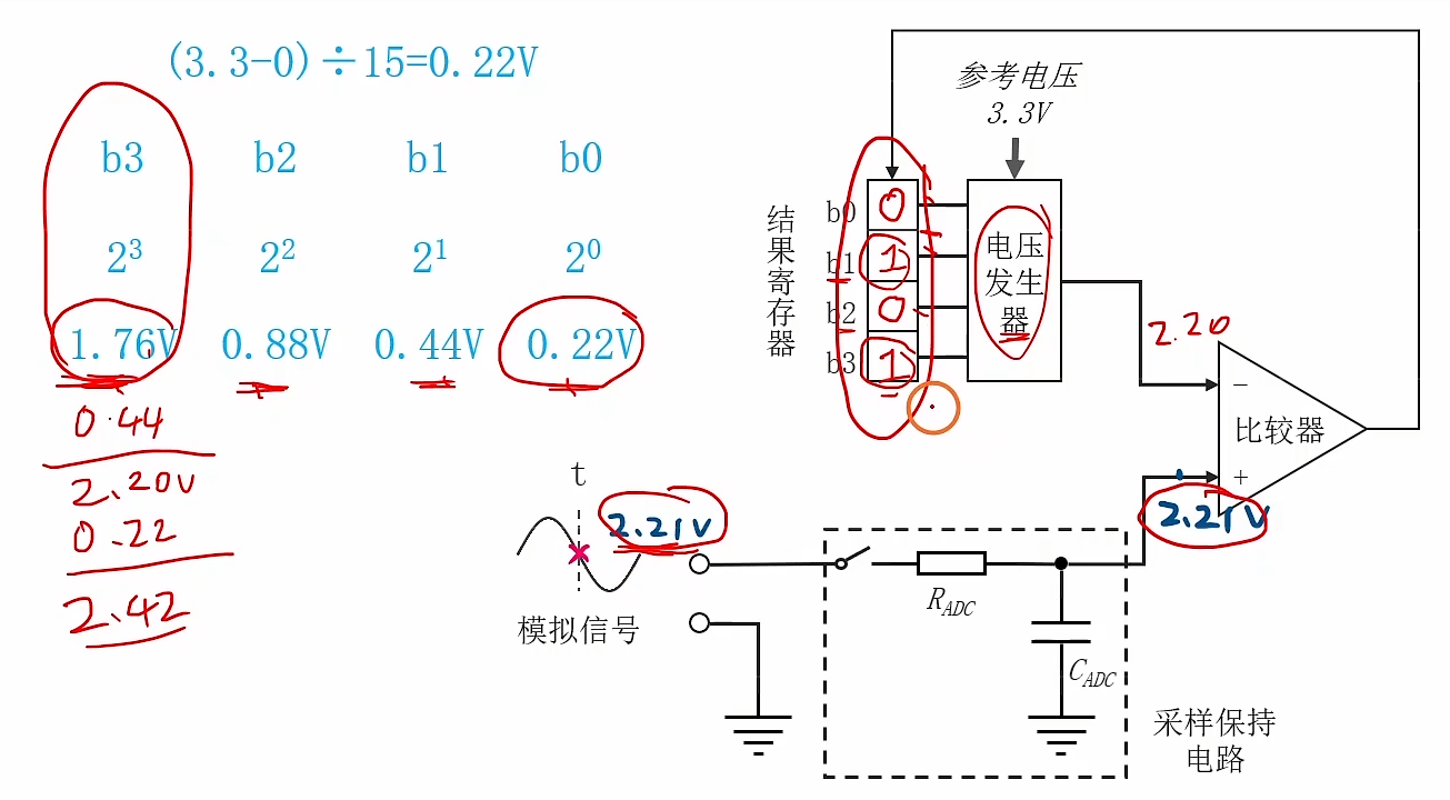ADC模块开始工作,为了方便演示,我们假设结果寄存器一共有四位,将3.3V电压分成15份,每份大小为0.22V.最高位大小为 2 3 ∗ 0.22 v = 1.76 V 2^3 * 0.22v = 1.76V 23∗0.22v=1.76V,最低位大小为 2 0 ∗ 0.22 V = 0.22 V 2^0 * 0.22V = 0.22V 20∗0.22V=0.22V.