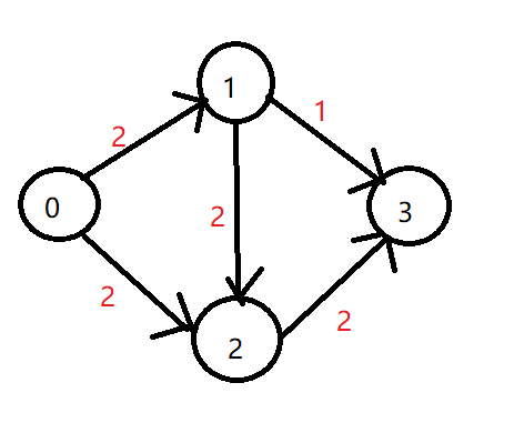 接着又找到了0123这条路线,其由于0到1的容量为1,所以整条路线最多只能运输容量1份,那就让max_flow累加1,接着所以正向路线容量-1,所有反向路线容量+1.这样就变成了0到1为0,1到2为1,2到3为1.同时3到2为1,2到1为1,1到0为1.