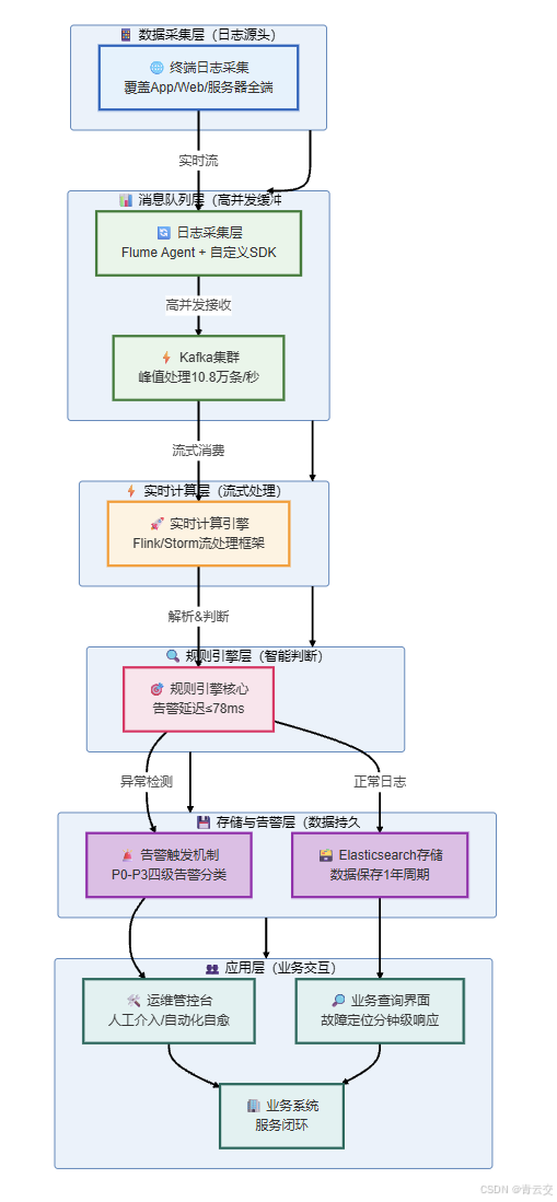 - 项目需求:双十一大促期间,日志流量峰值达 10 万条 / 秒,要求实现「实时日志分析 + 毫秒级告警 + 分钟级排障」,零日志丢失,告警延迟 < 100ms;