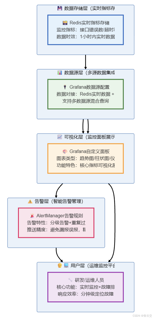 | 告警历史列表 | 近 7 天告警记录 | MySQL | 表格 | 1. 显示接口名称、错误数、告警级别、推送渠道;2. 支持按时间 / 级别筛选,便于回溯 | 故障溯源,分析历史规律,优化阈值 | 1 分钟 |