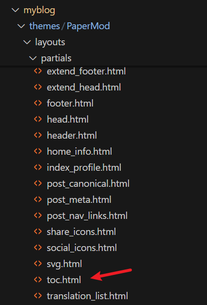 首先来添加 TOC(Table of Contents,文章目录),打开 PaperMod 主题 /themes/PaperMod/layouts/partials/toc.html 文件