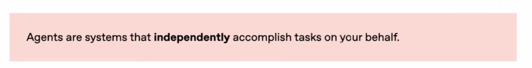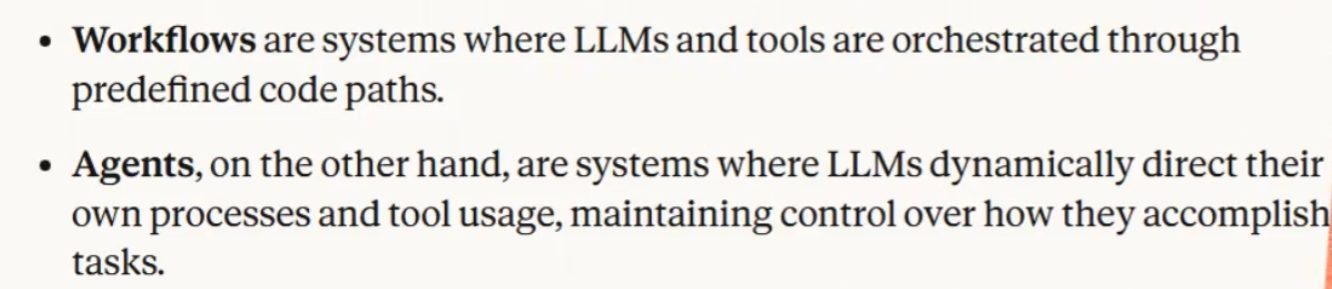 • Agent (智能体) :指的是由 LLM 动态地引导其自身流程和工具调用 的系统。Agent 能够代表用户独立完成任务,具有高度的独立性,并能根据环境反馈调整行动。