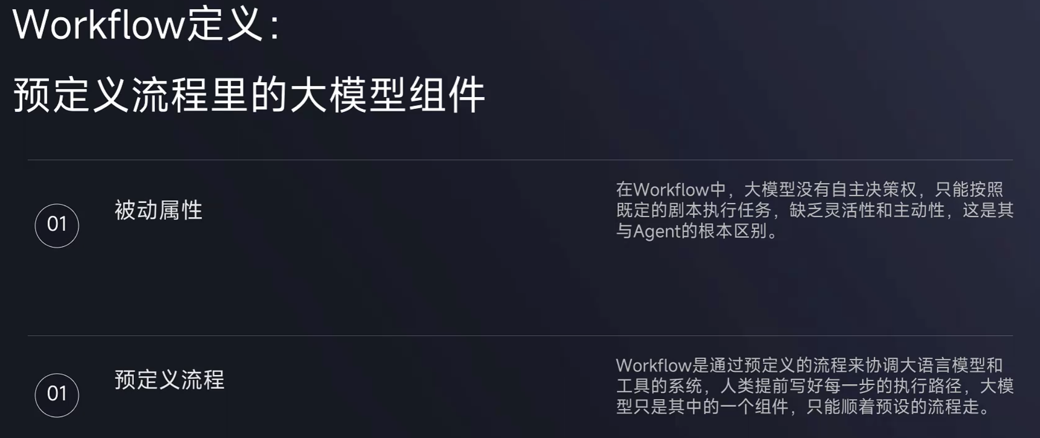 Anthropic 官方定义,可理解为:workflow就是按照剧本在演戏,大模型只是其中的小角色;Agent是一个导演,体现出 "自主",可以把Agent当成一个人来看,只不过现阶段的Agent的自主,可能是有局限的自主