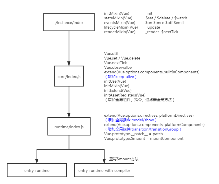 instance/index.js真正的Vue的构造函数,并在Vue的原型上扩展方法core/index.js增加全局API方法runtime/index.js扩展$mount方法及平台对应的代码