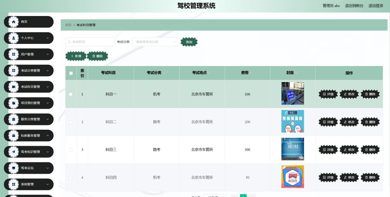 该系统通过信息化手段实现对驾校教学、学员管理、考试预约等各个环节的全面管理,有助于提升驾校的管理效率和服务质量。驾校管理系统采用先进的软件架构和数据库技术,实现了系统管理、考试科目管理、私教管理、订单管理、知识管理等功能。系统界面友好,操作简单,能够满足驾校日常管理的需求。
