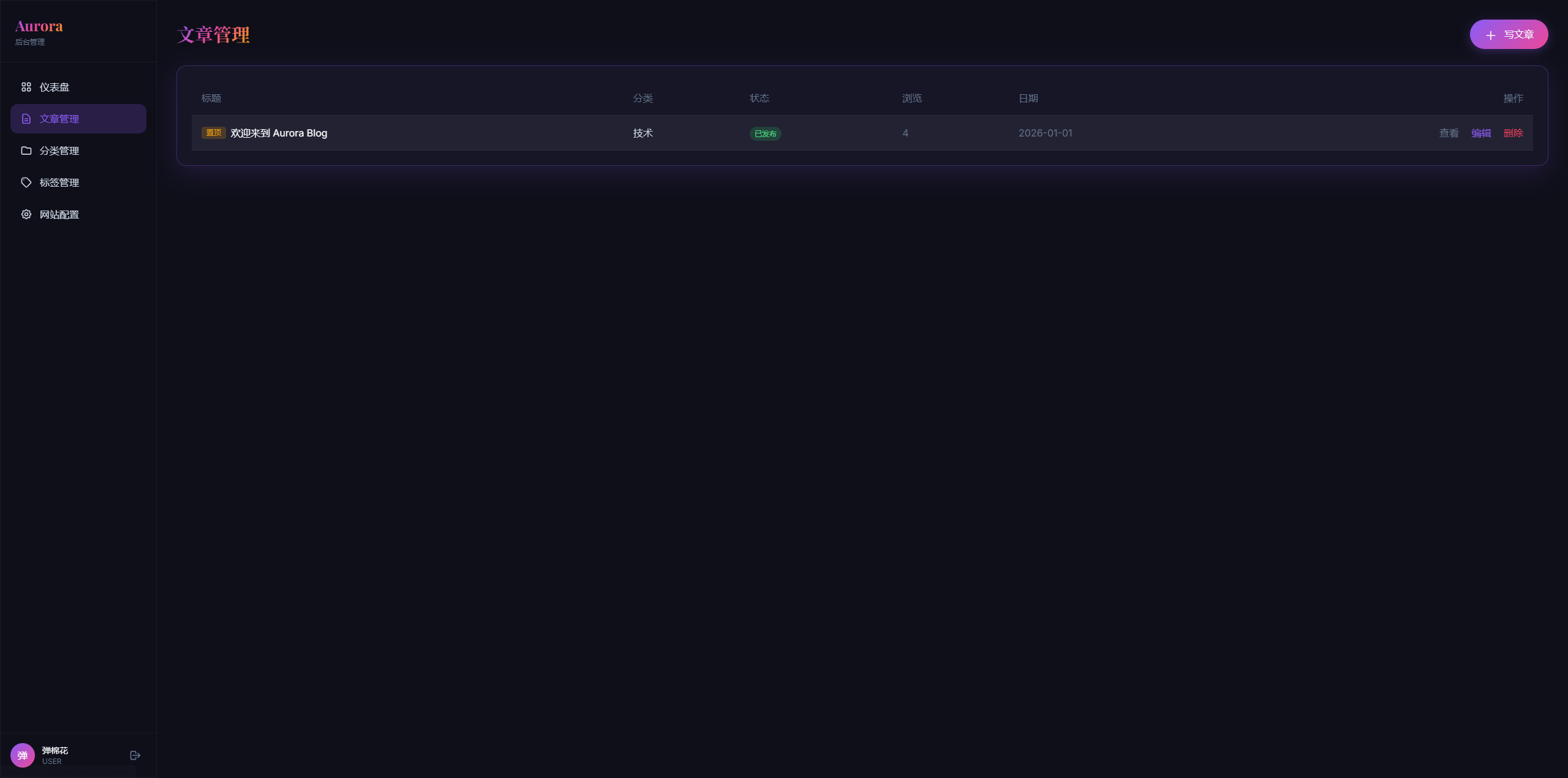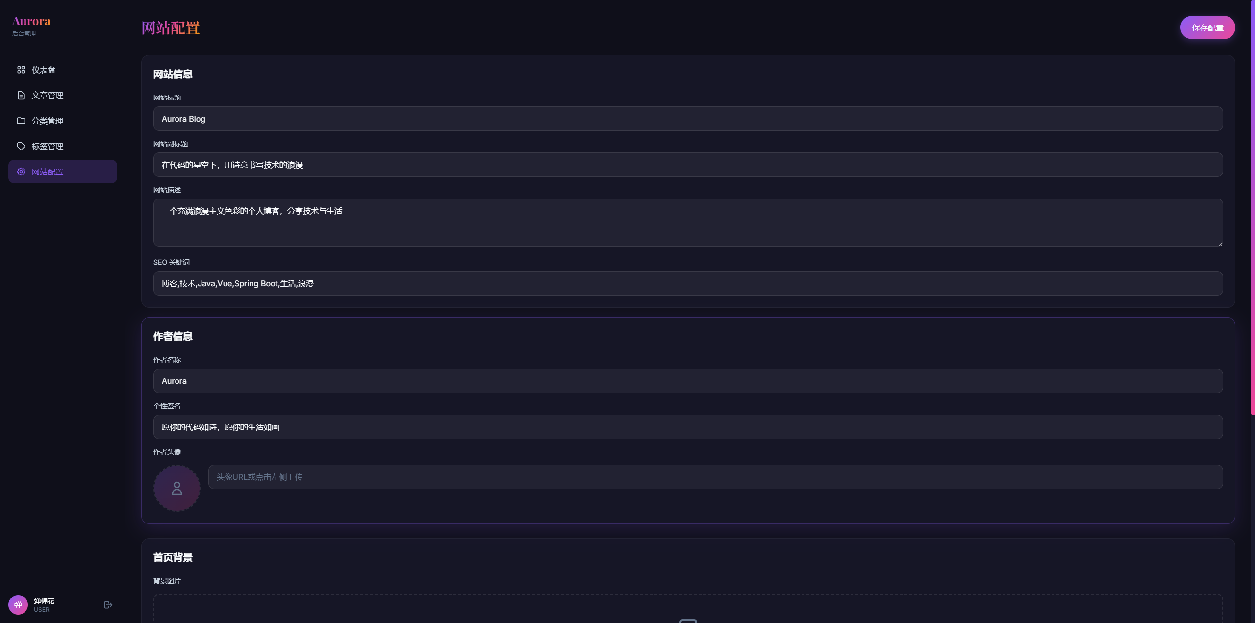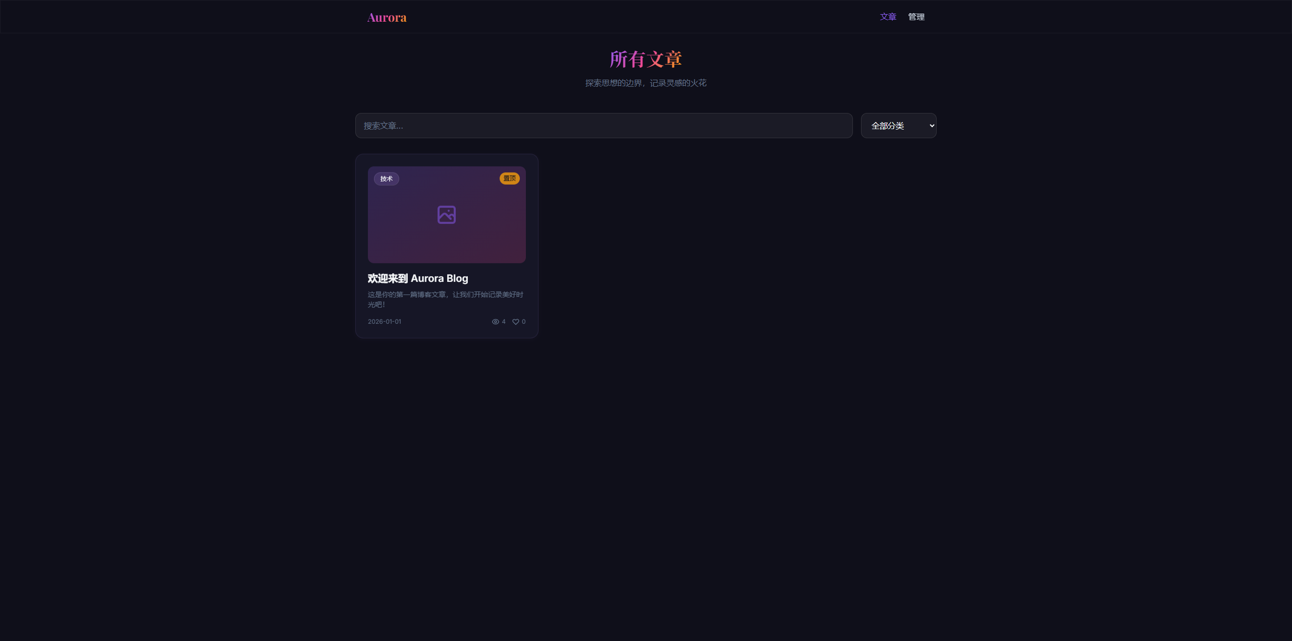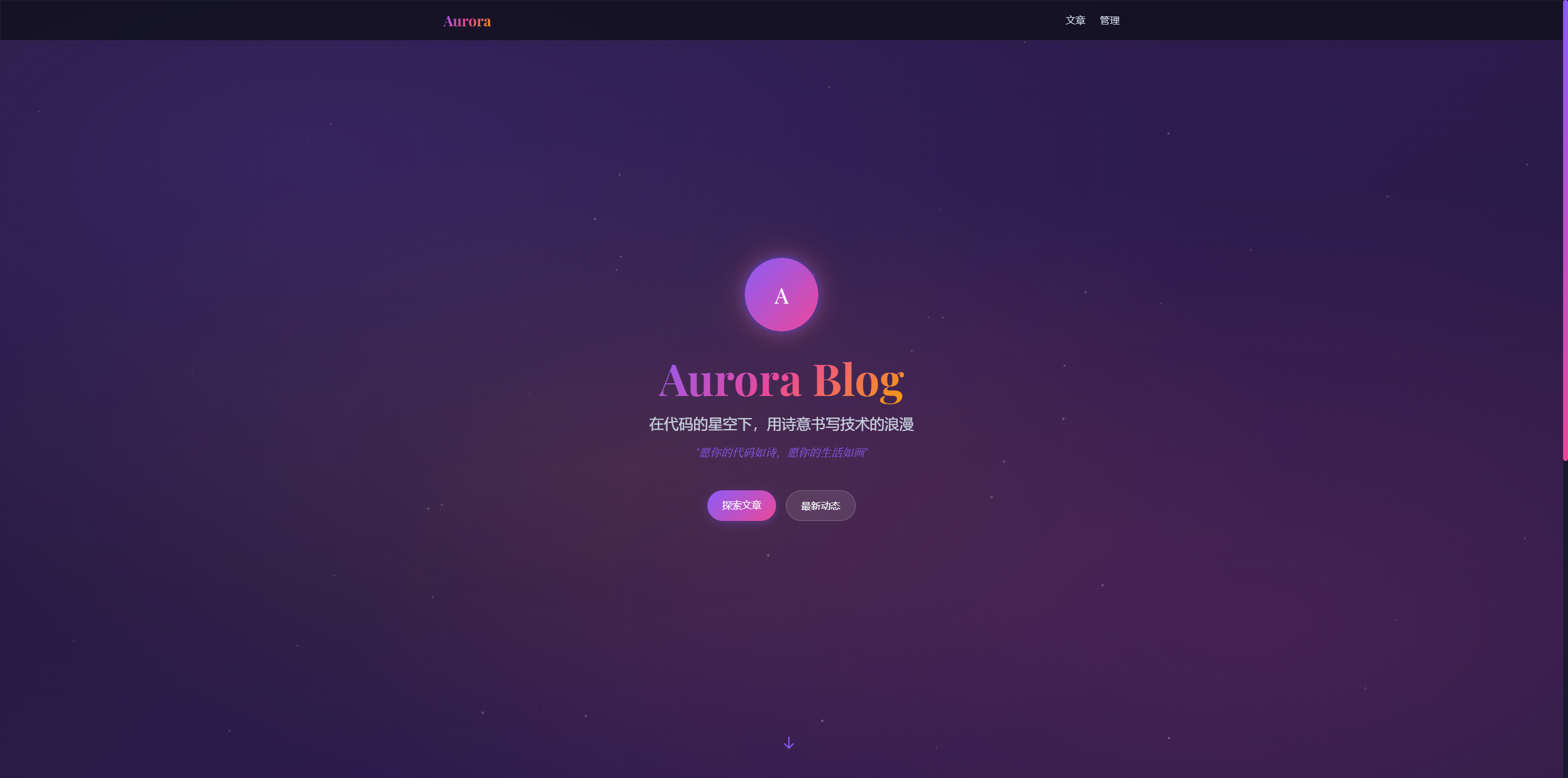 Aurora Blog(极光博客)是一款充满浪漫主义色彩的前后端分离博客系统。采用极光(Aurora)主题设计,融合了流动渐变、星光粒子、玻璃拟态等现代视觉元素,为用户提供优雅的写作与阅读体验。