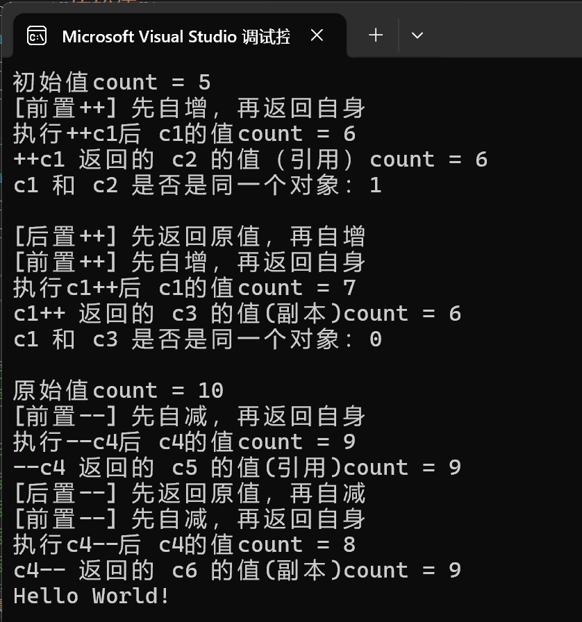 下面以自定义 Counter 计数器类为例,实现前置 / 后置递增 / 递减运算符,并展示两者的区别: