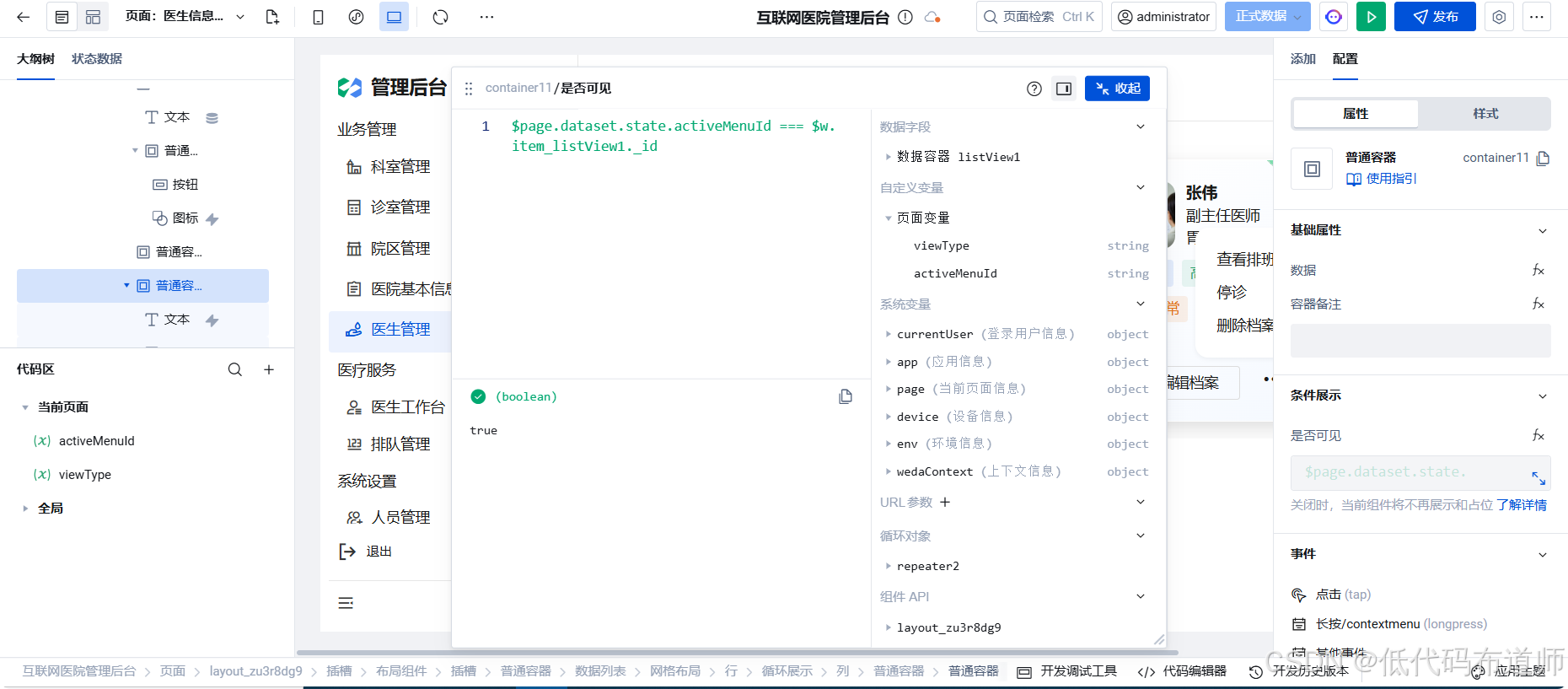 - 选中"菜单容器",在**"条件展示"**中绑定: