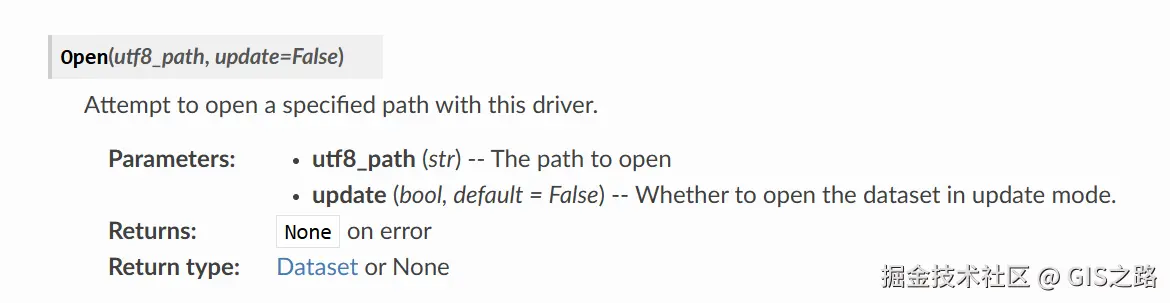 GDAL中可以使用Open方法直接打开数据源,进而读取图层数据。在GDAL Python API中,Driver和Dataset 类在Raster API文档中,既适用于矢量数据,也适用于栅格数据。