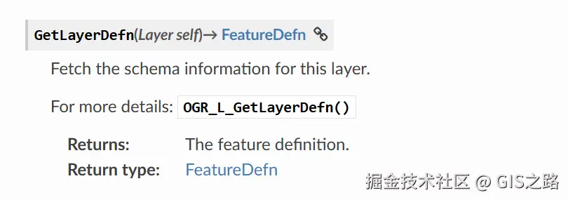 GetLayerDefn方法用于获取图层属性表,返回要素定义信息。