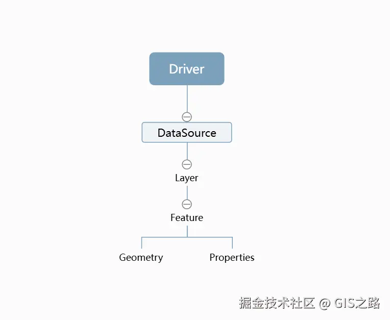 在GDAL中,矢量数据模型遵循下图所示结构,数据驱动->数据源->图层->属性。