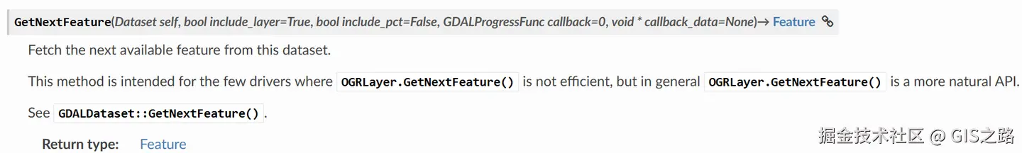 也可以通过GetNextFeature方法遍历要素特征,并且返回一个要素Feature。此方法适用于少数几个OGRLayer.GetNextFeature()效率不高的驱动程序,但总体而言,OGRLayer.GetNextFeature()是一个更自然的API。