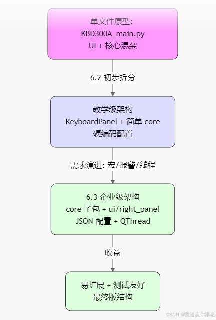 在上篇《6.2 用 PyQt5 实现 KBD300A 键盘的初步重构》中,我们从单文件原型(KBD300A_main.py)起步,完成了第一次拆分:将 UI 组件(如摇杆和 LCD)和基本核心逻辑分离。这一版本有效解决了单文件代码臃肿的问题,为快速迭代提供了基础。然而,随着项目开发的深入,新需求如宏脚本解释器、模板库、报警联动规则、实时日志面板和波形模拟器等不断涌现,原 6.2 架构在模块粒度、扩展性和线程安全上暴露了不足。例如,UI 与核心的耦合仍较高,新增功能往往需要修改多个文件,测试难度增大。