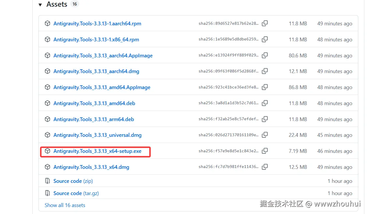 找到最新版本下载 Antigravity.Tools_3.3.13_x64-setup.exe 我这里使用windows平台安装包为案例,大家可以根据自己的操作系统选择。