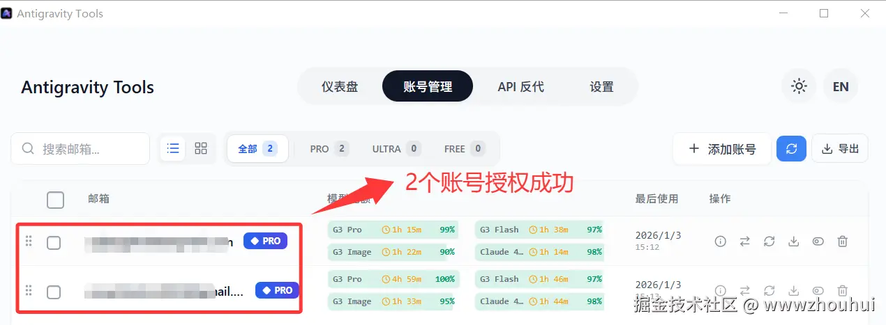 授权成功后我们看到Antigravity Tools 就看到管理账号授权界面
