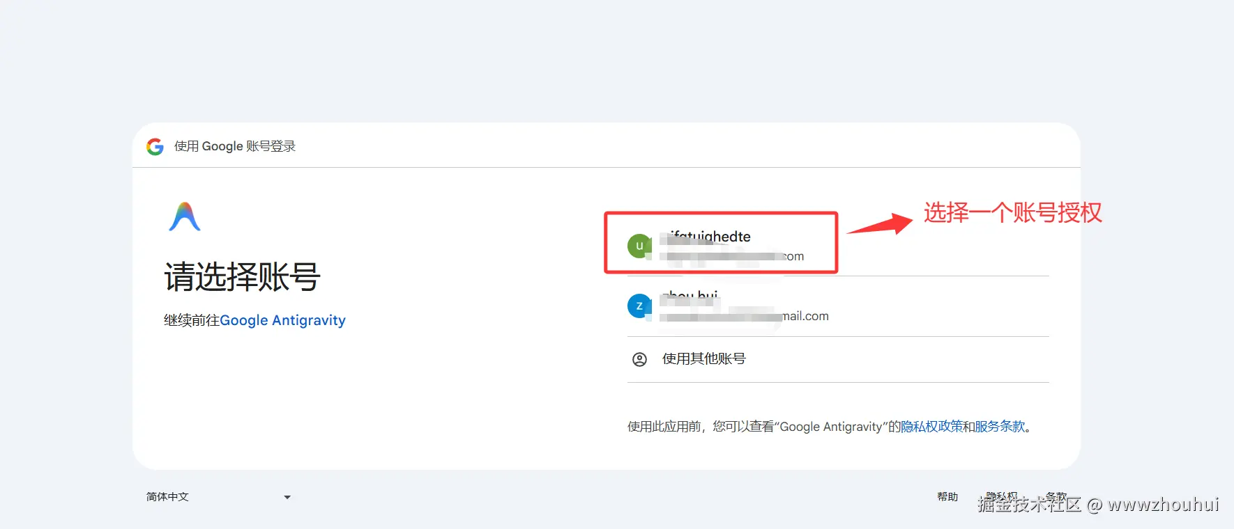 因为我浏览器之前记录2个google 的账号,所以我这边点击授权。弹出"Google Antigravity" 授权页面,点击登录按钮