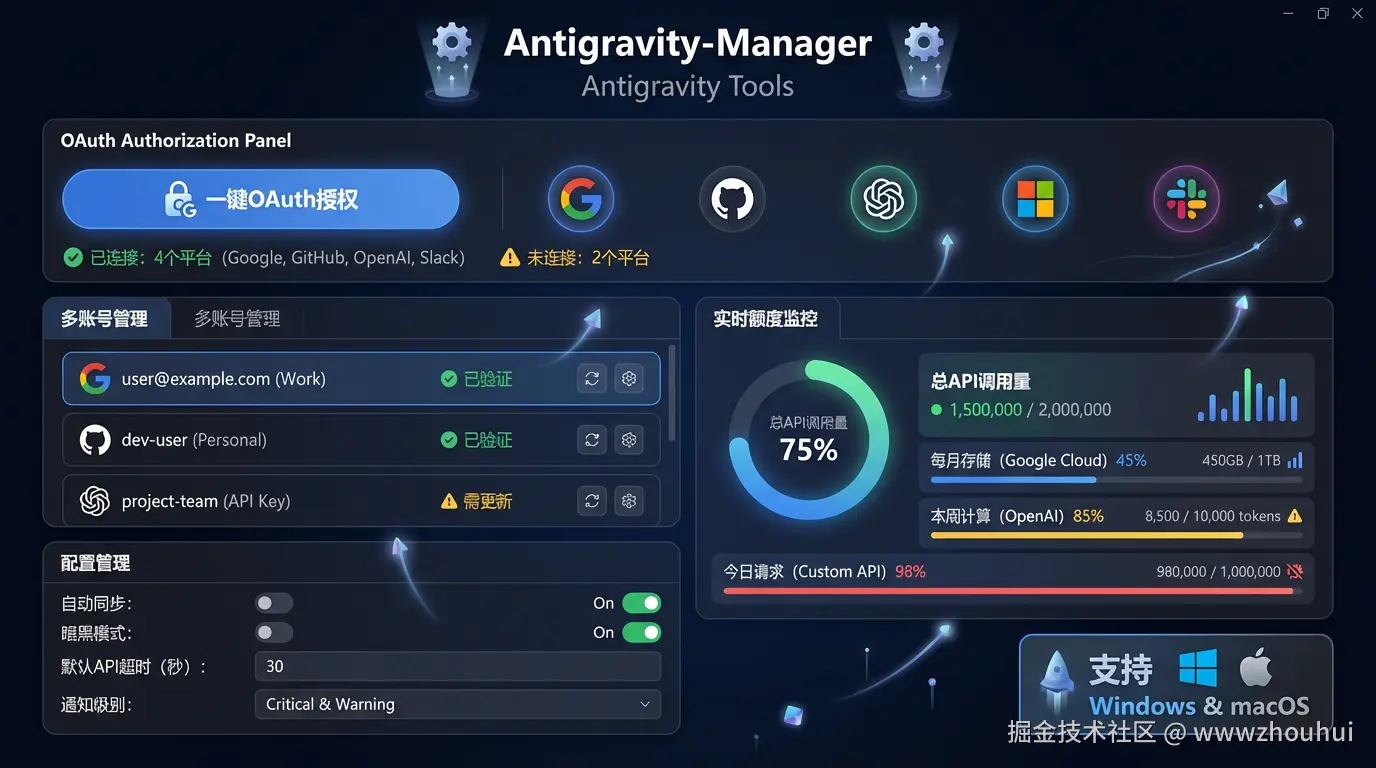 今天就给大家介绍一个更简单的方案------Antigravity-Manager(又名Antigravity Tools)。这是一款专业的AI账号管理与协议转换桌面应用程序,相比CLIProxyAPI的"命令行+Docker"部署方式,Antigravity Tools直接提供了可视化图形界面,支持一键OAuth授权、多账号管理、实时额度监控,整个配置过程鼠标点点就能搞定,对新手极其友好。更重要的是,它同时支持Windows和macOS平台,不管你用什么系统都能轻松上手。