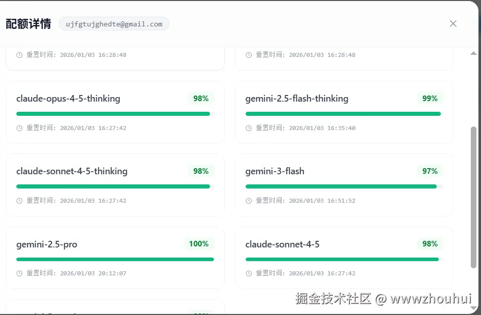 这里我们很方便查看到账号授权模型使用额度。通过上面的方式我们就完成了Antigravity 反带了。