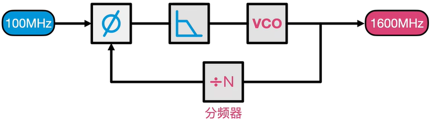 最后,我们将传给鉴相器的频率进行分频,即可得到倍频后的频率了,其倍频的后的 f2 频率就是 f1 频率乘分频器的分频值。