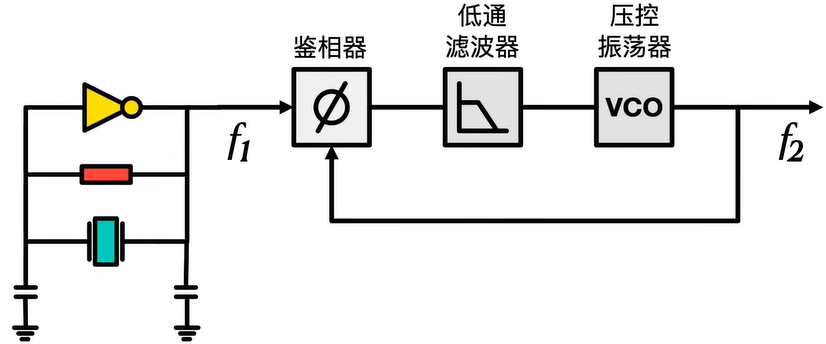 输入频率 f1 是一个稳定的频率源,比如他可能是一个晶振电路: