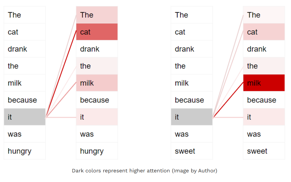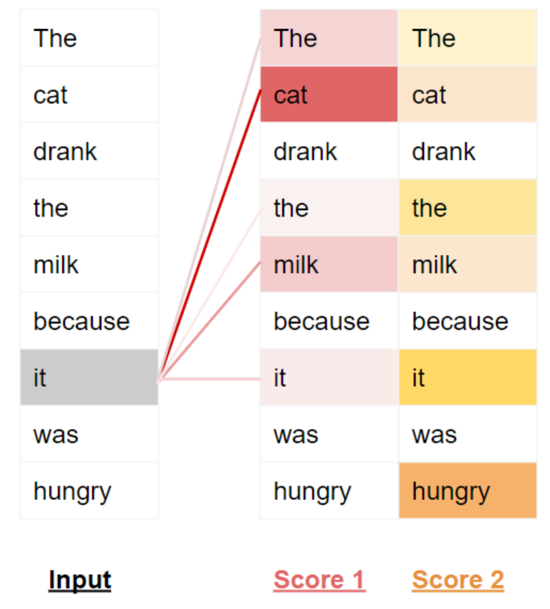在第一个句子中,代词 "它" 指代的是 "猫";而在第二个句子中,"它" 指代的是 "牛奶"。当模型处理 "它" 这个词时,自注意力机制会为模型提供更多与该词含义相关的信息,从而让模型能够将 "它" 与正确的指代对象关联起来。