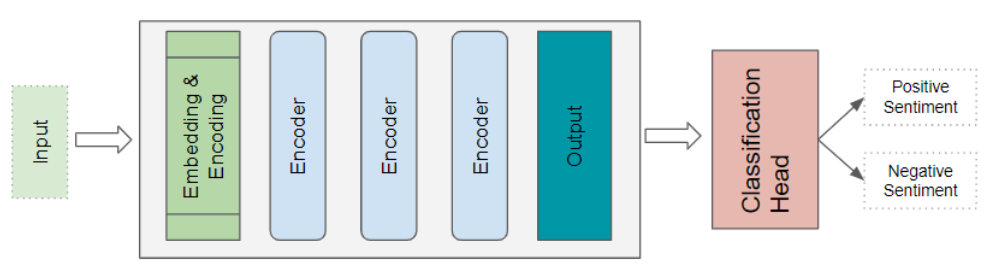以情感分析任务为例(Sentiment Analysis:固定译为情感分析 ),该架构会接收一份文本文档作为输入。分类头模块( Classification head:译为**分类头模块)**会获取 Transformer 的输出特征,并生成类别标签的预测结果,例如判断文本情感为积极或消极。