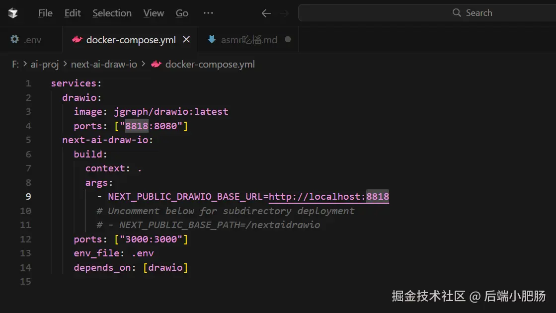 注意:为了防止和本地其他服务冲突,我将 drawio 的端口修改为了 8818。如果你本地 8080 没被占用,保持默认即可;如果占用了,记得像我截图里一样,同时修改 ports 和 env 文件里的端口号。