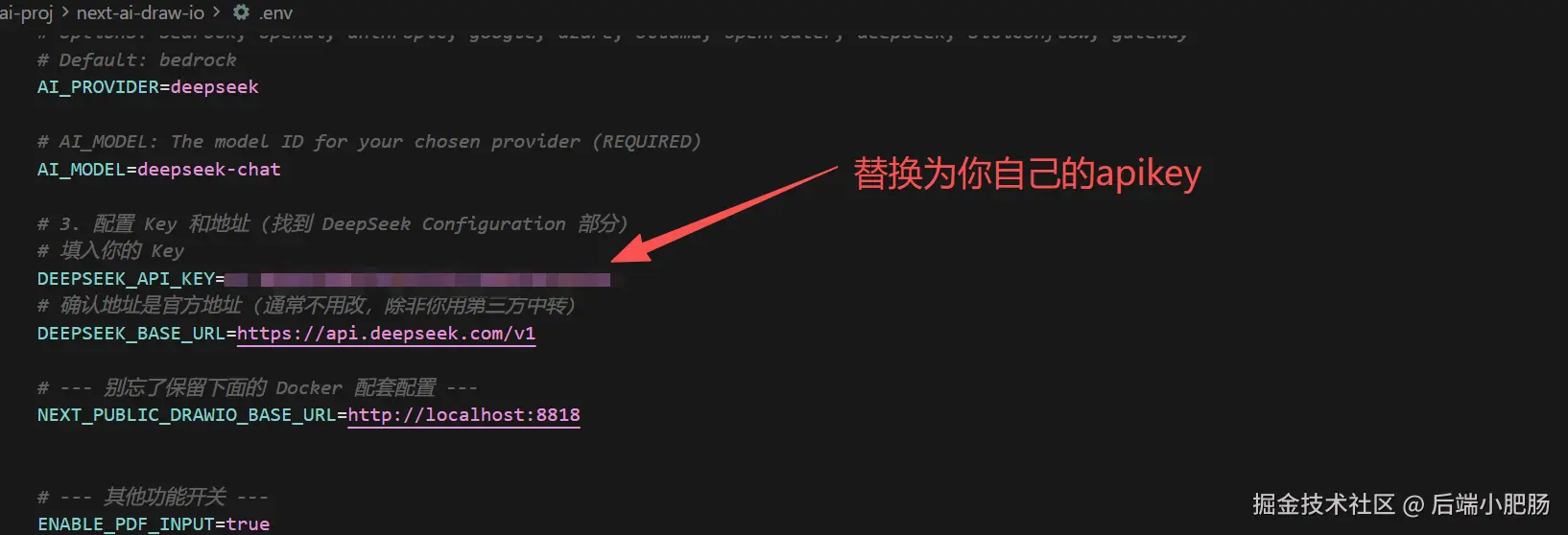 在.env文件中进行大模型配置用来驱动drawio绘图操作,下图中我配置的是deepseek,你也可以配置其他模型: